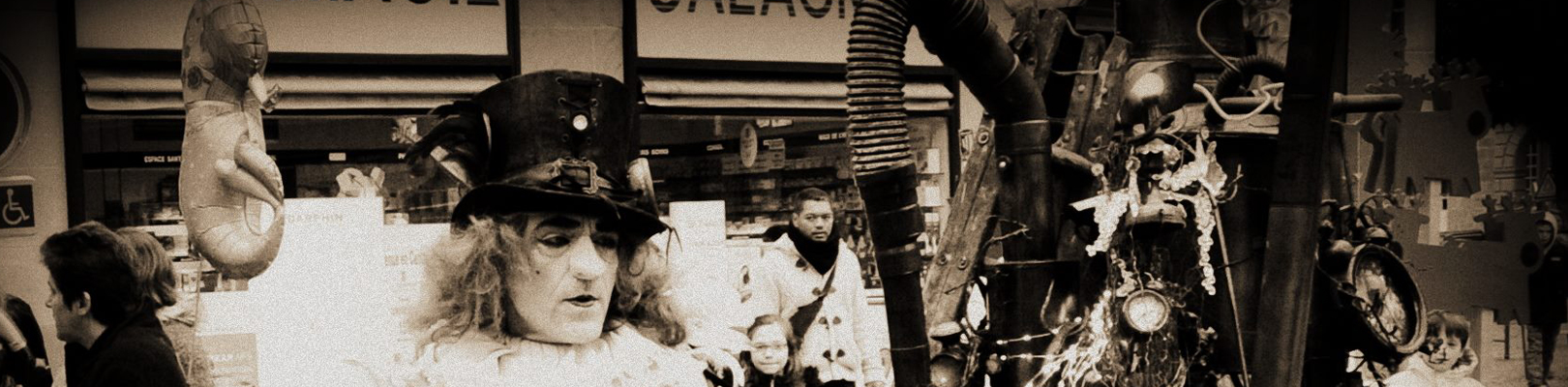 La déambulation comprend 4 personnages + une marionnette à fils dont un échassier avec une charrette sonorisé