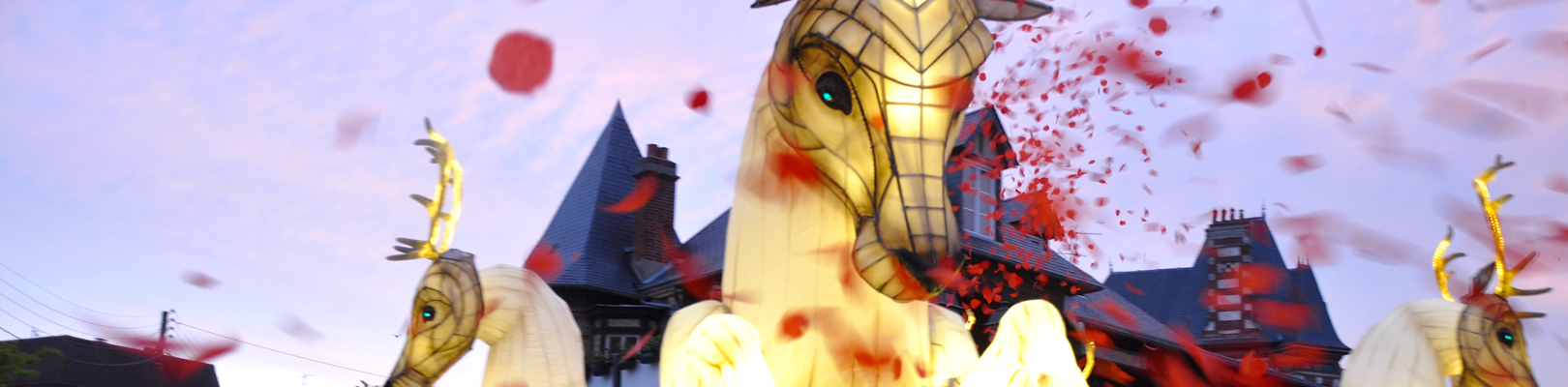 «Les Cerfs» : 6 danseurs manipulateurs de marionnettes articulées géantes gonflées et lumineuses